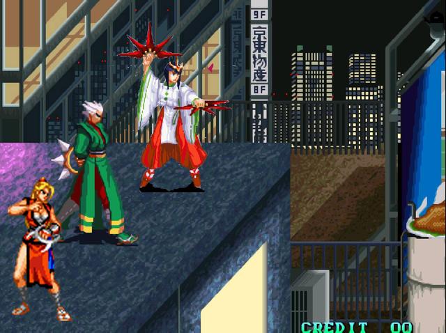 醉虎和骸罗、和仲都能打出一个“喝”。不过醉虎的“喝”属于是飞行道具,而和仲的则是近身投技。那么刚好,《真侍魂》中也有一位巫女打扮的人物:罗将神。和游戏中的市川准非常相似。