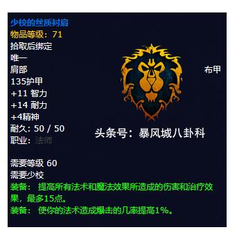 T1肩膀法伤加成是9点,这件绿装26点,你选哪件,我去,谁还要T1啊,绝对垃圾中的战斗机!