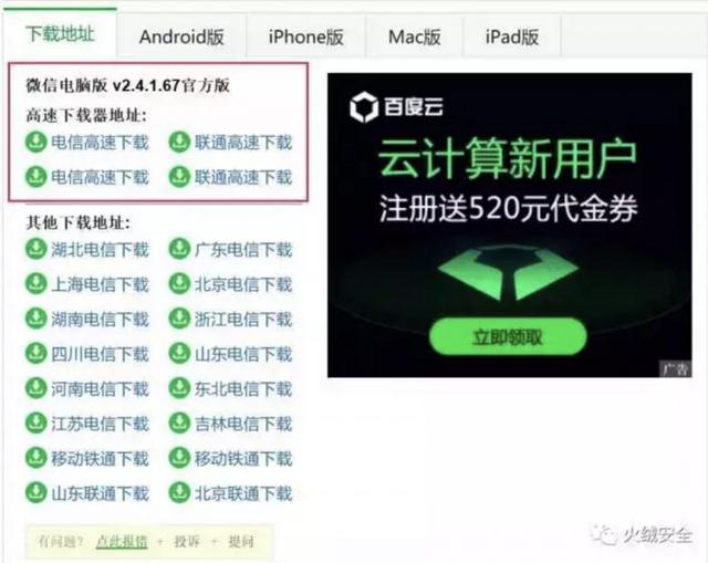以xx6下载站为例,进入微信电脑版下载页面,整个页面除了广告以外就是诱导用户安装下载器(图中红色区域),而且即使用户正确的点击了图中绿色按钮的本地下载(图5),也会用高速下载描述欺骗用户使用下载器(图6)。