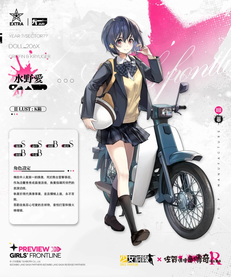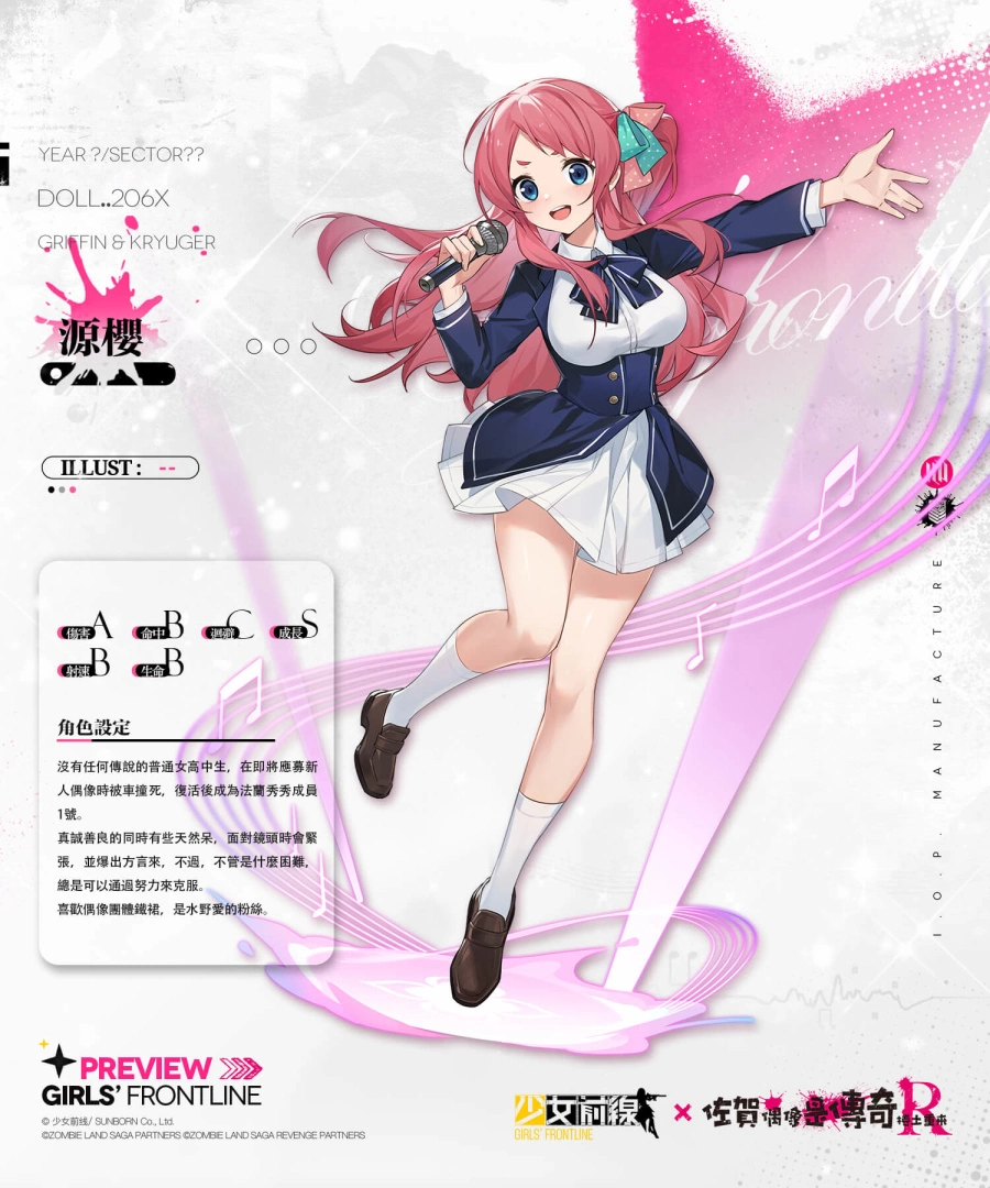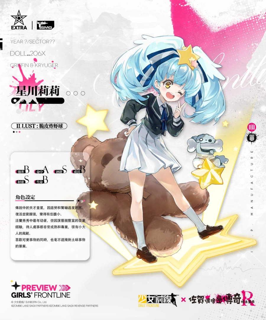 为摆脱失眠的困扰,阴错阳差地成了殭尸偶像的製作人?本次《少女前线》与《佐贺偶像是传奇R》联动期间,通关联动剧情「雪浪映花颜」的指定活动战役时,可获取包含联动特典人形「夕雾」、「星川莉莉」、「山田妙」、替代核心、记忆碎片等奖励!