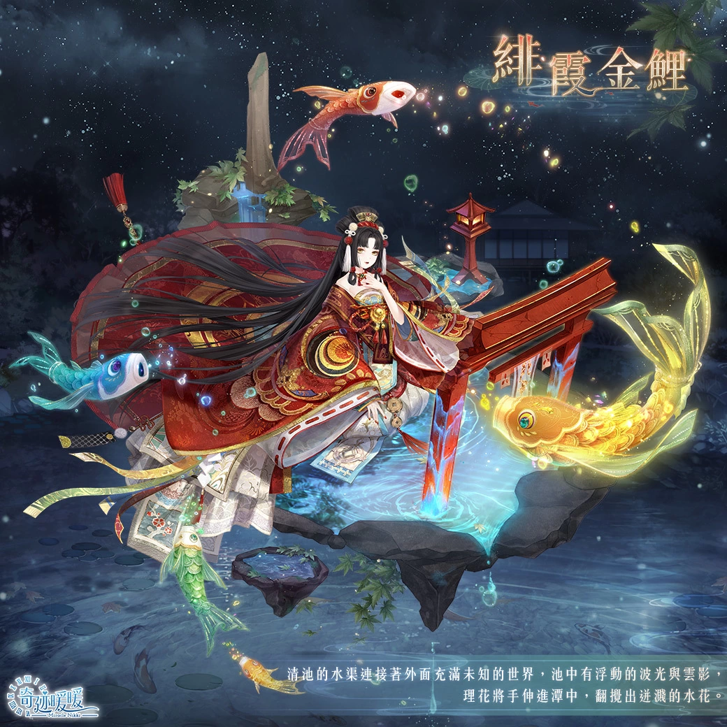 清池的水渠连接着充满未知的世界。每每轻摇串铃,池中便会泛起波光,一条通身纯金的鲤鱼跃然水上。全新活动「衿袖池鳞」将从 19 日上午 5 点至 25 日止限时推出。活动期间内,搭配师购买「遇鲤心笺」,可抽取精緻云端套装「绯霞金鲤」部件,购买首张「遇鲤心笺」还可享半价优惠。