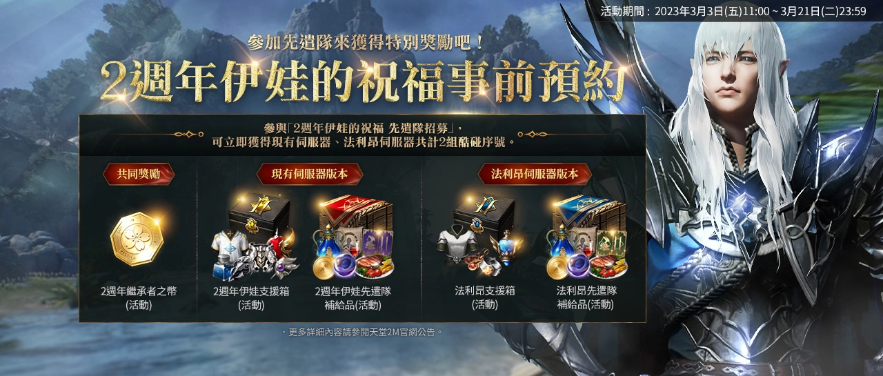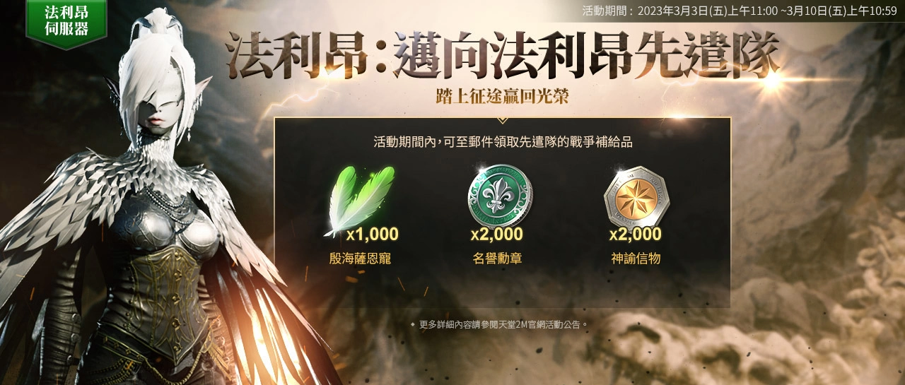 【法利昂:迈向法利昂先遣队】3/3上午11:00~3/10上午10:59,活动期间内可至邮件中领取先遣队的战争补给品,包含「殷海萨恩宠*1,000、名誉勋章*2,000、神谕信物*2,000」等奖励。