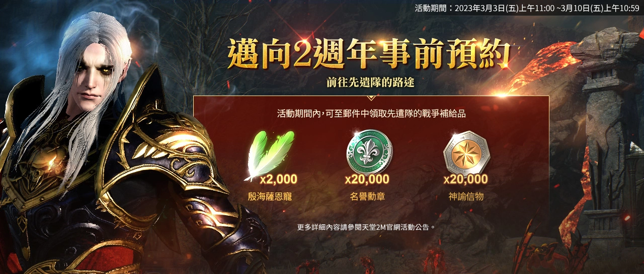 【迈向2週年事前预约】3/3上午11:00~3/10上午10:59,活动期间内可至邮件中领取先遣队的战争补给品,包含「殷海萨恩宠*2,000、名誉勋章*20,000、神谕信物*20,000」等奖励。