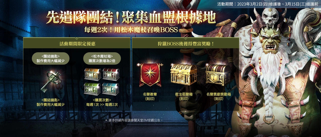 【先遣队团结!聚集血盟根据地】3/2维护后~3/15维护前,活动期间限定优惠,「团结钥匙」製作费用大幅减少、「松木魔杖箱」购买次数增为2倍。此外,狩猎BOSS后将获得包含「名誉徽章(刻印)、君主名誉箱(刻印)、名誉贡献奖励箱(刻印)」丰富奖励。