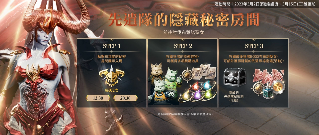 【先遣队的隐藏秘密房间】3/2维护后~3/15维护前,活动期间内,每天2次可点击「布莱诺的秘密房间」图示入场,狩猎登场的幸运怪物,可获得多项奖励道具;狩猎最后登场BOSS「布莱诺圣女」,可额外获得隐藏的先遣队秘密箱(活动)。此外,活动期间内,每天上午09:00将透过邮件发送一次奖励,可获得包含「殷海萨恩宠*2,000、先遣队成长箱(活动)」等道具。