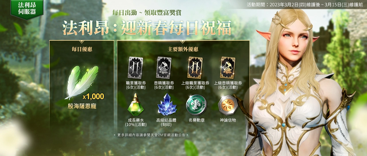 【法利昂:迎新春每日祝福】3/2维护后~3/15维护前,活动期间内,可用302金币开启「迎新春」每日培育优惠,透过每日优惠可获得「殷海萨恩宠*1,000」、以及包含「上级职业获取券(6次)(活动)、上级壶精获取券(6次)(活动)、职业获取券(6次)(活动)、壶精获取券(6次)(活动)、成长药水(10%)(活动)、高级结晶体(刻印)、名誉勋章、神谕信物」等额外优惠。