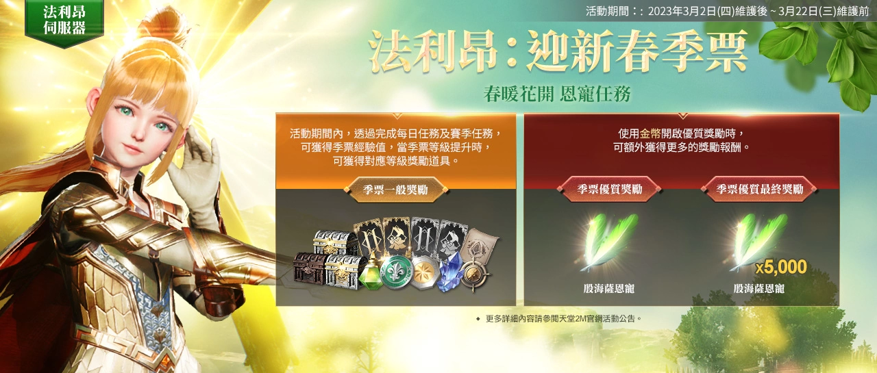 【法利昂:迎新春季票】3/2维护后~3/22维护前,活动期间内,透过完成每日任务和赛季任务,可获得季票经验值,当季票等级提升时,可获得对应等级的奖励道具。使用金币开启优质奖励时,可额外获得更多的奖励报酬。