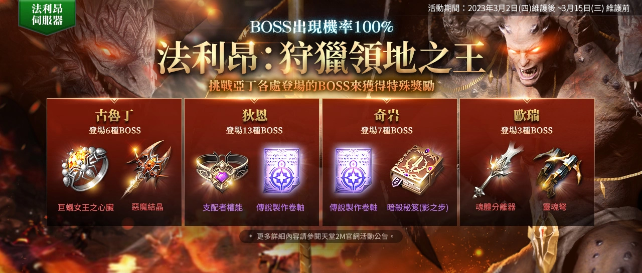 【法利昂:狩猎领地之王】3/2维护后~3/15维护前,活动期间内,包含古鲁丁登场6种BOSS、狄恩登场13种BOSS、奇岩登场7种BOSS、欧瑞登场3种BOSS,在重置时间将以100%的机率出现。