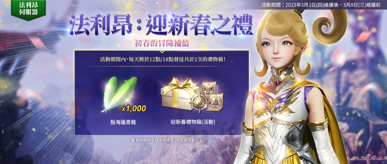 【法利昂:迎新春之礼】3/2维护后~3/8维护前,活动期间内,每日中午12点、下午18点将透过邮件发送共计2次的礼物箱,可获得「殷海萨恩宠*1,000、迎新春礼物箱(活动)」等道具。
