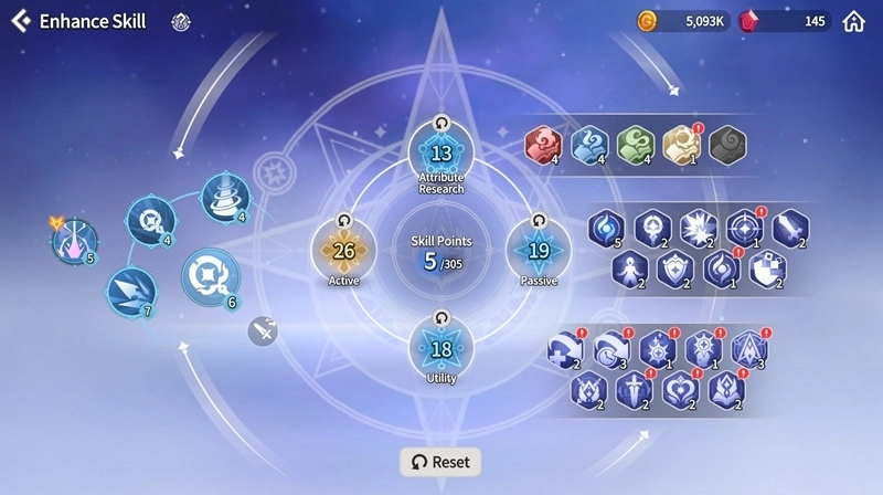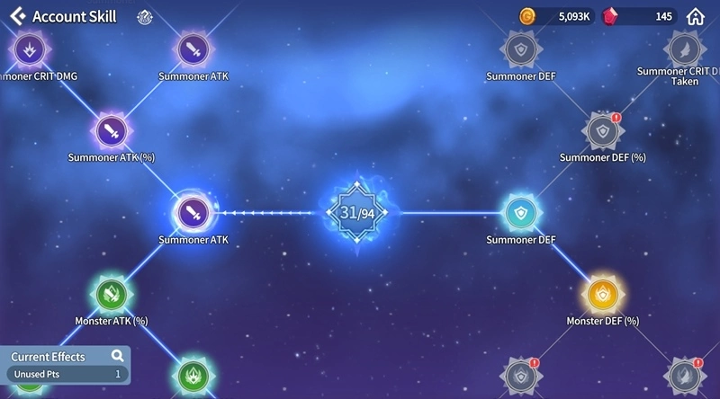 帐号技能可分为召唤师及魔灵的体力、迴避、防御等生存数值或是攻击、暴击、技能冷却等攻击数值共四个面向;召唤师技能则是分为主动、被动、属性研究、实用共4种方向的技能。玩家需根据召唤师与魔灵阵容的搭配进行策略性的数值分配,使用有限的点数发挥最大的效益。