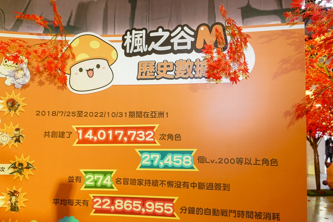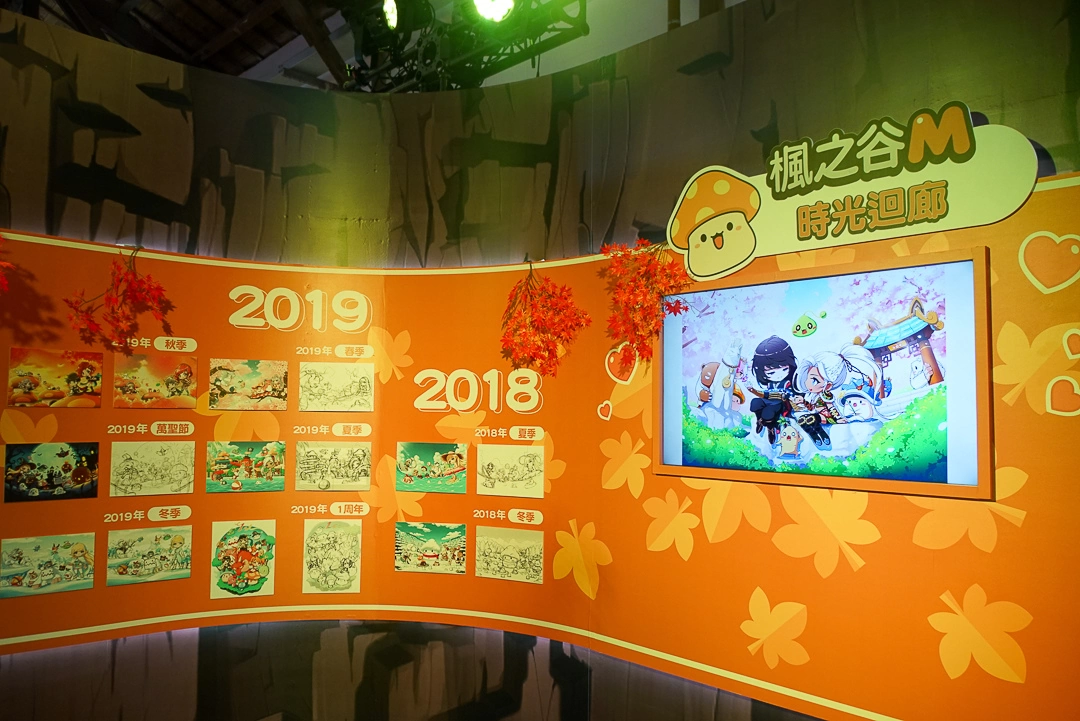 首先迎接《枫之谷 M》玩家到来的是枫叶盛开的「时光迴廊大事纪」,展区中可一览自 2018 年以来的登入画面与开发团队设计手稿,改版职业,以及游戏于周年时举办的活动回顾,玩家还能看到来自官方统计的各项游戏数据。