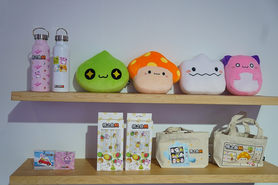 来到商店区,《枫之谷M》中人气怪物绿水灵、皮卡啾、菇菇宝贝、雪吉拉为主题设计的麻糬抱枕、悠游卡、小餐袋、造型地垫、运动水瓶及主题服饰现场每日限量贩售,要收藏的粉丝可要把握机会了!