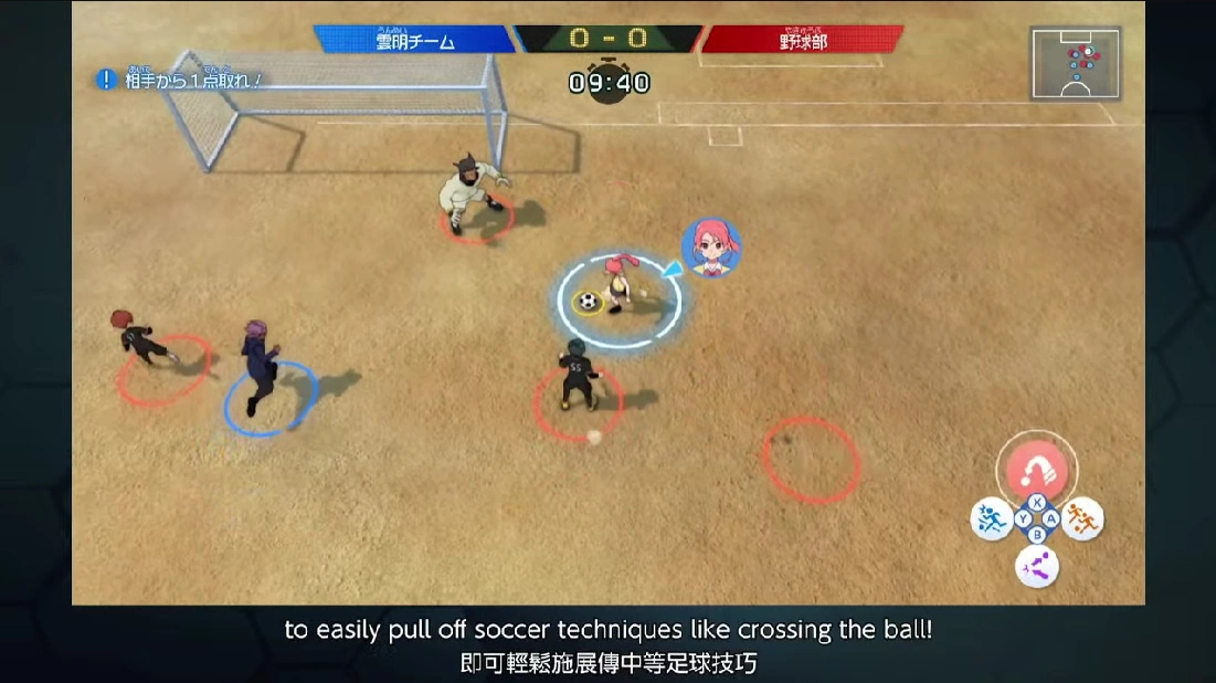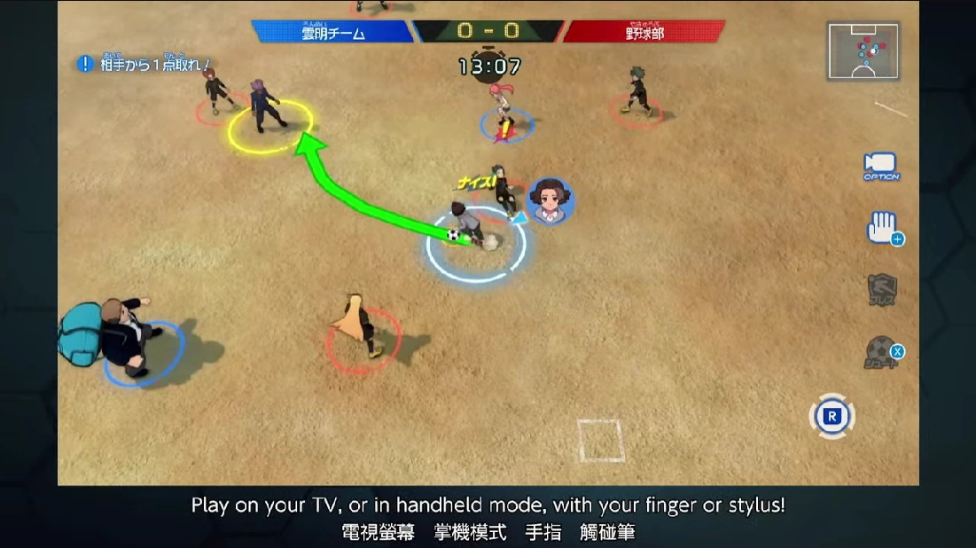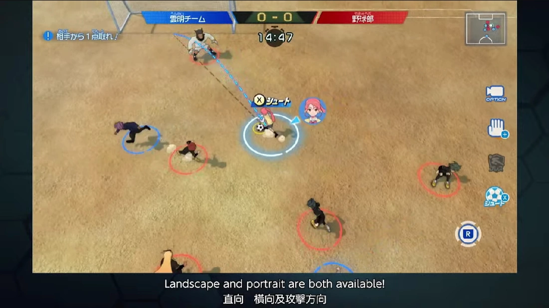 至于在本作的操作玩法方面,本作将会採用支援 5vs.5 足球对战的高自由度比赛系统。玩家可以透过电视萤幕、掌机模式、手指、触控笔等各种方式进行角色操作移动,或是使用直向/横向/攻击方向等不同角度来进行游戏操作。