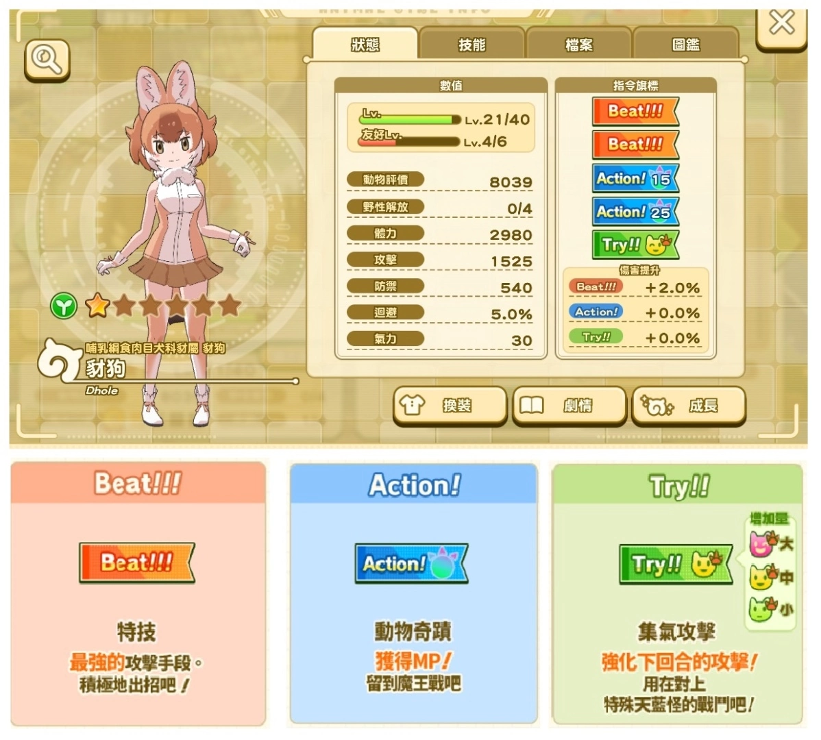 游戏战斗方式为回合制战斗,队伍由 5 位动物朋友角色组成,在游戏中还有指令旗标等特性,分别有 Beat!!! 、Action! 以及 Try!! 三种类型。各个朋友都有 5 个指令旗标,颜色的组成各不相同,灵活运用旗帜的设定,也会产生动物合唱的效果,发挥出絶佳的效果喔!