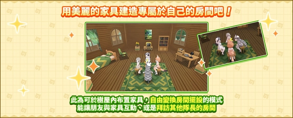 蒐集各式各样的家具,用美丽的家具打造属于自己的房间,各位 Friends 可于树屋内自由的变换房间摆设的模式,能让朋友与家具进行互动,或是拜访其他队长的房间!并可设定想邀请来房间游玩的朋友,已设定的朋友在战斗中的友好值获得量将会依家具持有数提升获得量。
