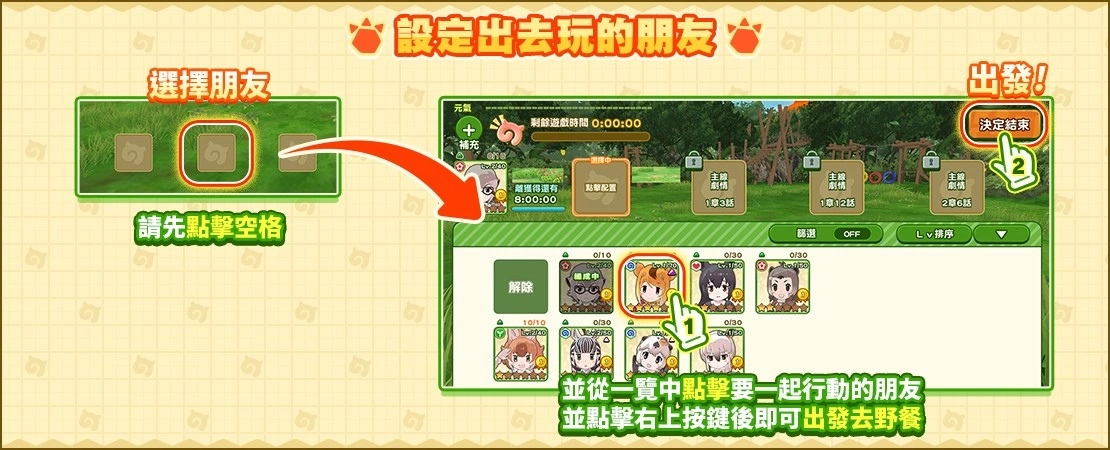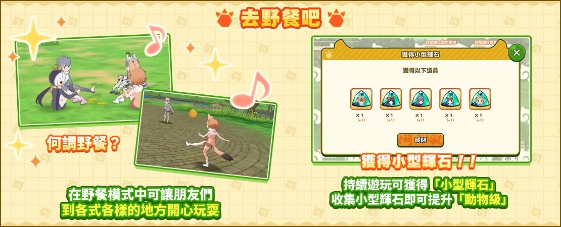 在野餐模式中,可让朋友们到各式各样的地方玩耍,持续玩耍游玩的过程中,可获得提升动物级用的『小型辉石』!营运团队这边温馨提醒,野餐一阵子之后会肚子饿,请记得带上加帕里食物来补充大家元气吧!