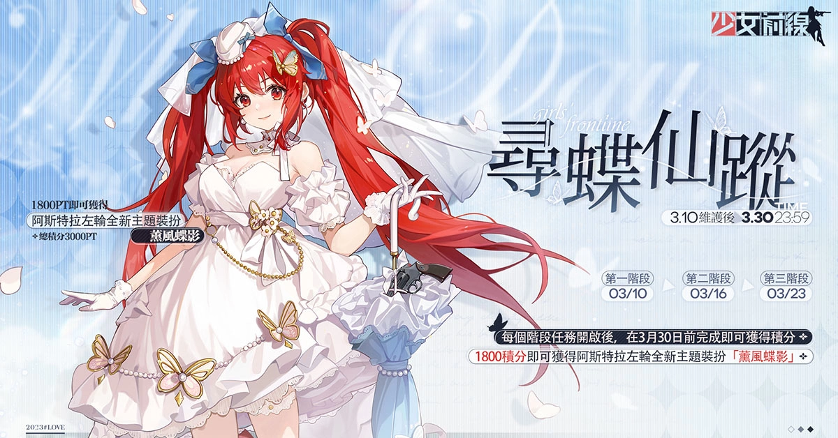 龙成网路代理之手机游戏《少女前线》于今(10)日维护后推出白色情人节採购主题装扮「人形的花园」与限定纲领活动「寻蝶仙蹤」。繁花盛开的花园里,换上婚纱的人形与你许下永恆的约定。详情请参考以下报导。