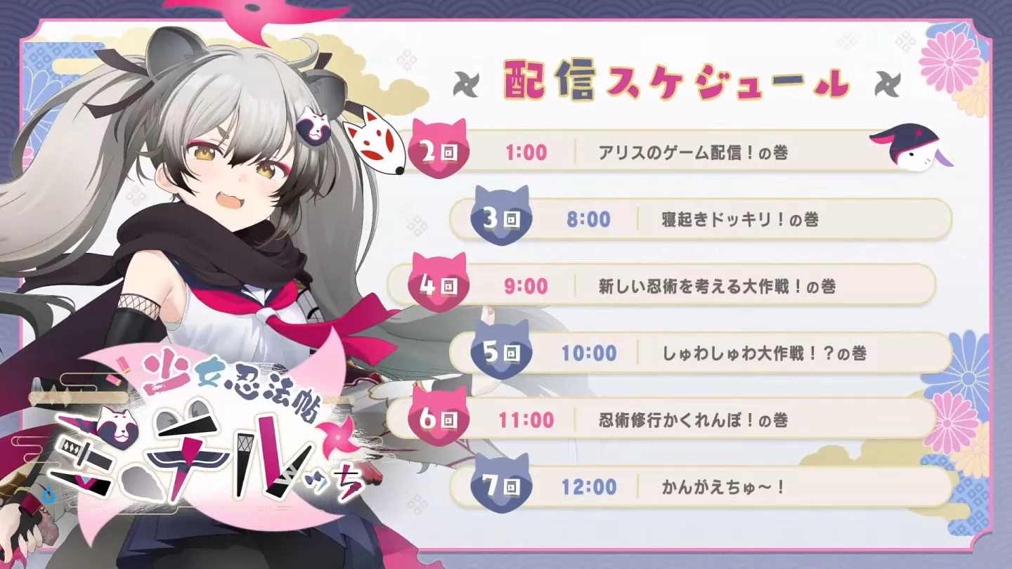 日版《蔚蓝档案》则是以游戏中「百鬼夜行联合学园」忍术研究部部长开设的频道「少女忍法帖 小小三千留」频道设定,于今(4/1)準备了一连串的影片上传让玩家同乐,由忍术研究部的学生成员以及千年学园的游戏部团宠「天童爱丽丝」带来许多愚人节限定的直播内容,