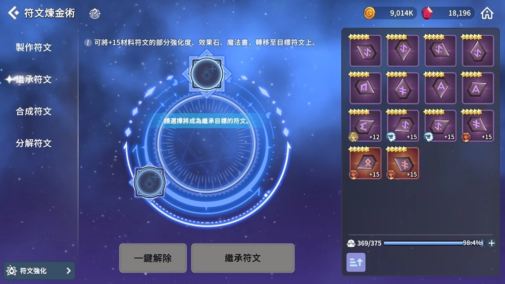 2、继承符文:使用1个强化至上限(+15)的符文来提升目标符文的强化度。目标符文的强化度,将根据用于材料符文的强化石(经验值)可提升的最大强化度来增加。材料符文的镶嵌道具,则可直接移动至目标符文上。