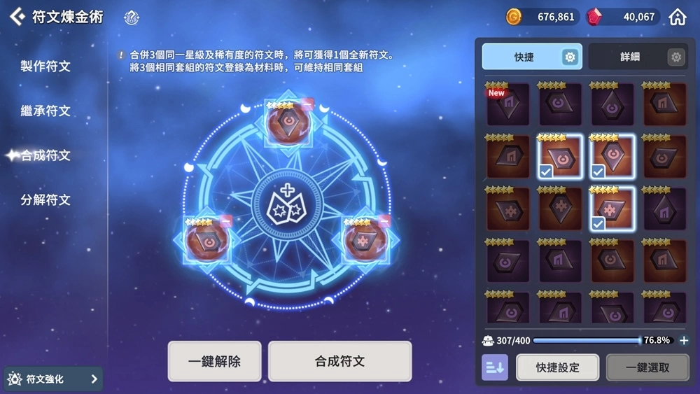 3、合成符文:透过组合3个相同星级/稀有度的材料符文来获得相同星级/稀有度的全新符文。当登录3个相同套组的材料符文时,将可获得相同套组的符文。合成5星英雄符文后出现「大成功」时,将可获得5星传说符文;而合成4星符文时出现「大成功」,则可获得5星符文!