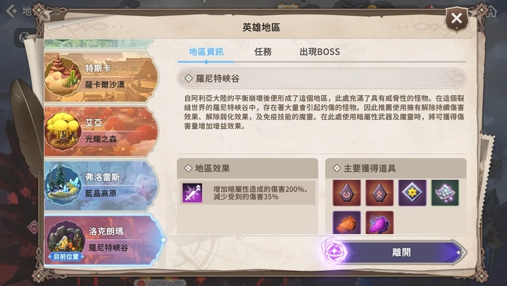 在完成地区探索任务「裂缝世界」后每个大陆将各新增1个英雄地区。玩家于英雄地区击杀一般怪物、菁英怪物、Boss后,皆可获得对应的奖励,如刻印石、符文碎片、5星英雄/传说符文、符文/服装製作材料、金币等珍稀道具。
