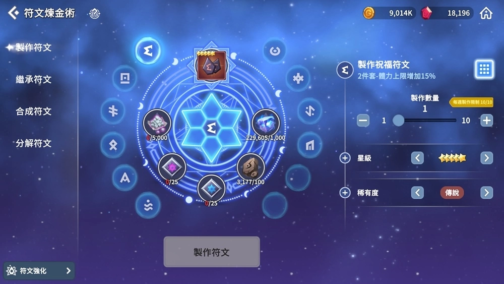 1、製作符文:可透过设定想要的套组/稀有度/星级来製作符文,所需材料将按照设定的属性而定。