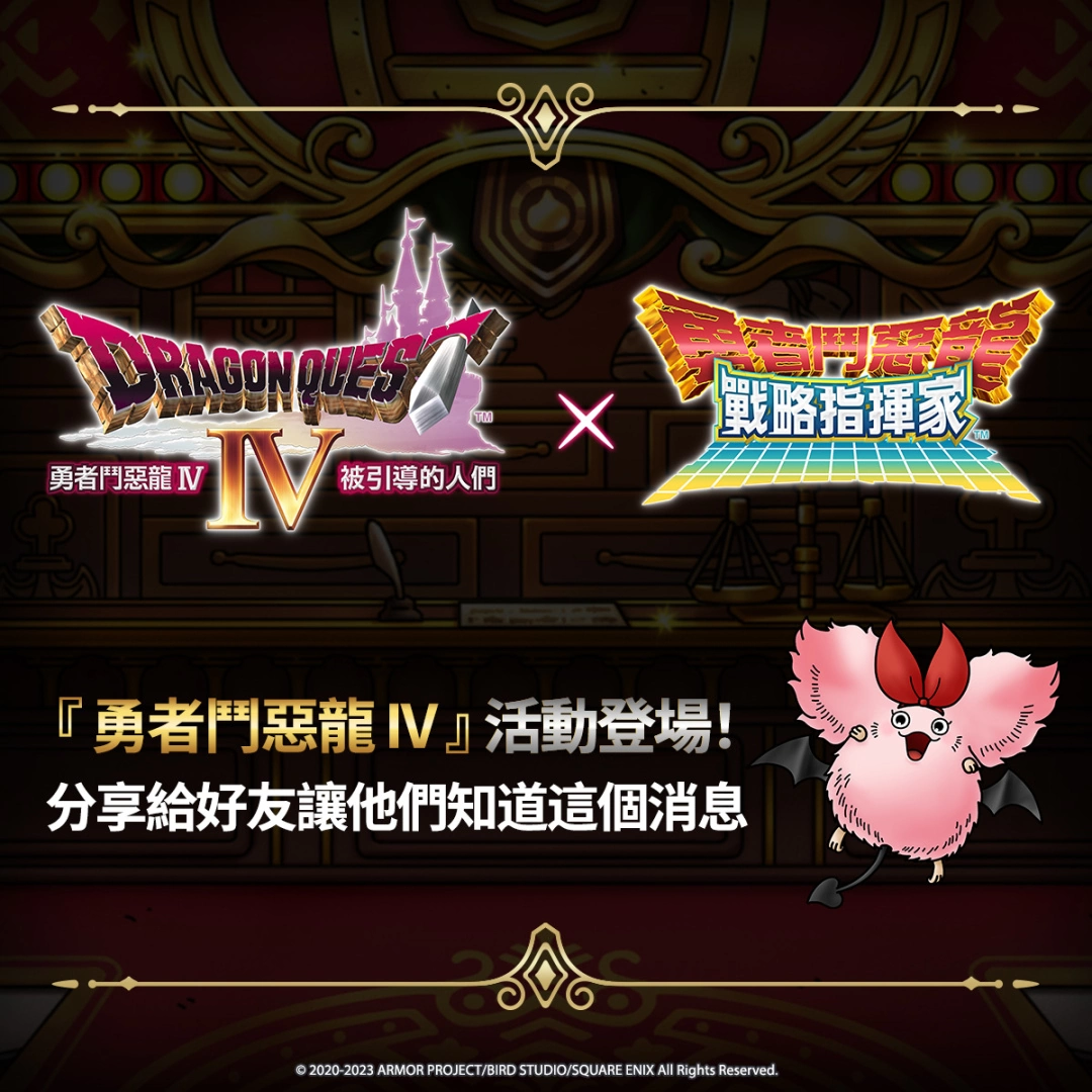 接下来《勇者斗恶龙 战略指挥家》国际版粉丝团预计将会举办一系列《勇者斗恶龙 IV》连动活动的社群活动,奖品不仅有《勇者斗恶龙 战略指挥家》的可爱周边,更有徵召券、角色培育素材等着各位大师,现在就先按讚并且追蹤粉丝团,活动开始就可以第一时间参加!