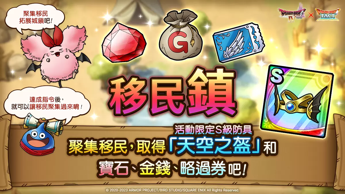 会随着聚集的移民数量逐渐拓展城镇发展度的新游戏内容「移民镇」登场!达成活动指令后就能凝聚「移民」,让「移民」聚集过来使城镇发展就能拿到报酬。拓展城镇,取得活动限定S级防具「天空之盔」、「宝石」和「略过券」等豪华报酬吧!