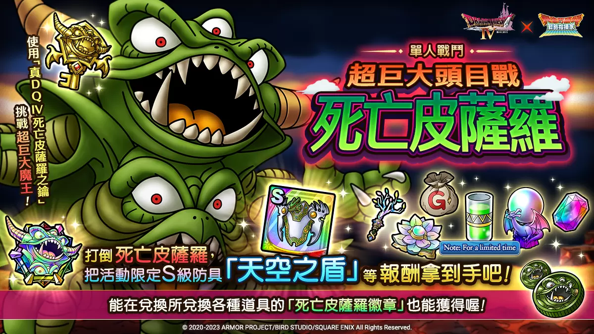 《勇者斗恶龙 战略指挥家》国际版目前正进行以《勇者斗恶龙 IV》世界为题材的系列活动,在原创剧情的活动任务中,可让活动限定A级角色「霍伊米恩」加入,并且获得S级防具「天空之盾」和「天空之盔」、「真DQ IV 旗帜」、「真DQ IV死亡皮萨罗之钥」等内容!