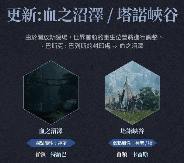 法利昂伺服器今(22)日开放新猎场「血之沼泽(首领特论巴)」、「塔诺峡谷(首领卡雷斯)」,由于开放新猎场,世界首领的重生位置将进行调整,巴斯克:巴列斯的封印处-血之沼泽。