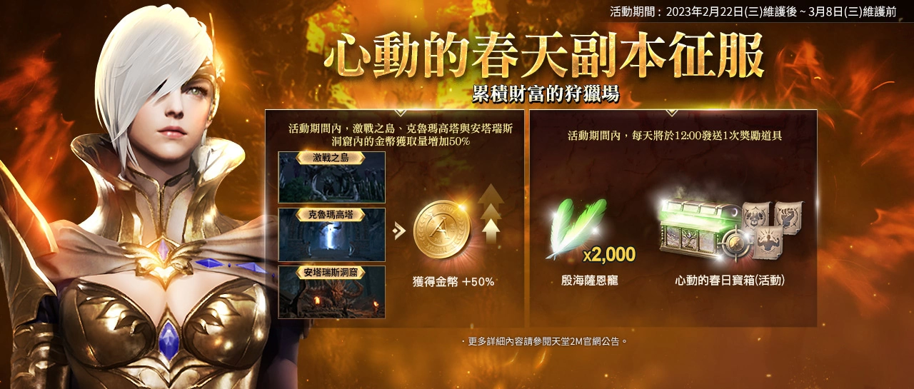 【心动的春天副本征服】2023/2/22维护后~2023/3/8维护前,活动期间内,激战之岛、克鲁玛高塔、安塔瑞斯洞窟副本内的金币获取量增加50%。此外,活动期间内每日中午12:00将透过邮件发送「心动的春天宝物」,可获得包含「殷海萨恩宠*2,000、心动的春天宝箱(活动)」奖励道具。