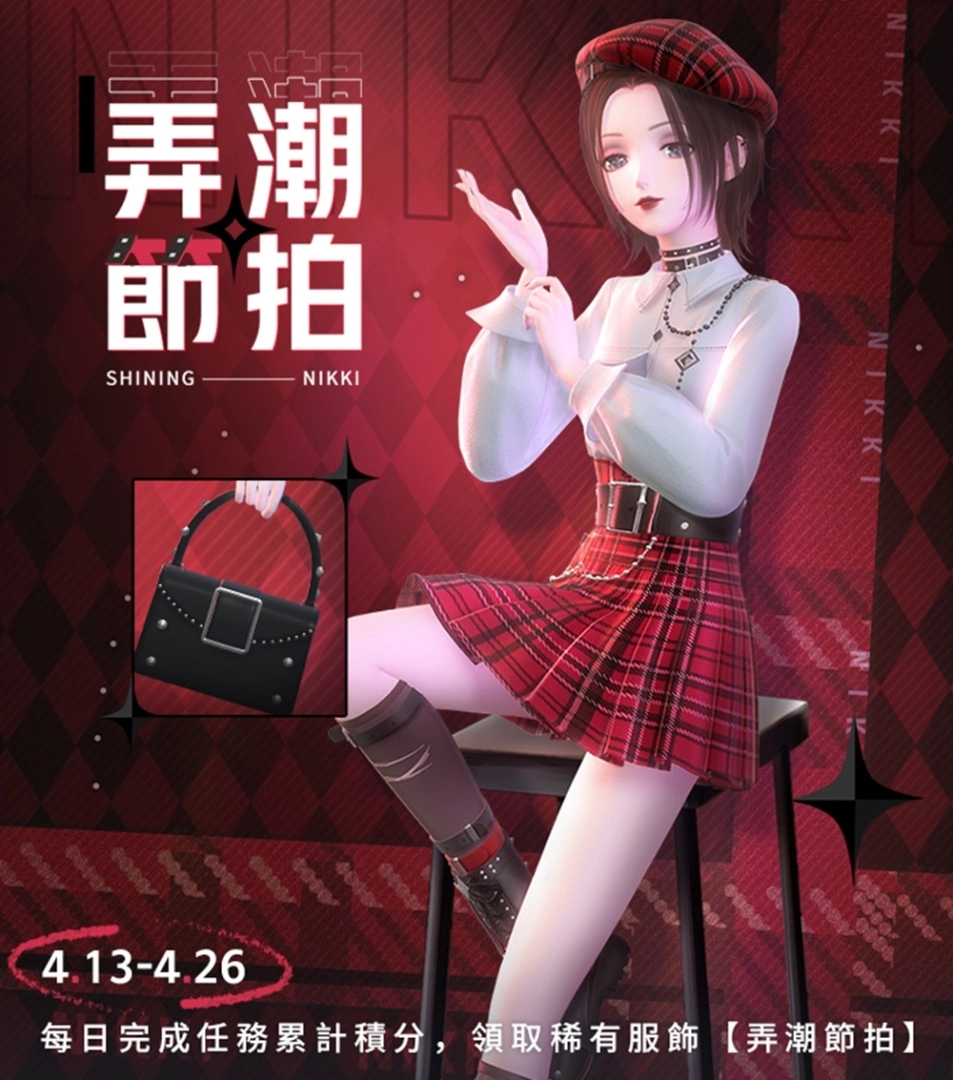 此次游戏更新后至 4 月 26 日,玩家完成每日任务累计积分, 即可免费获取稀有服饰「弄潮节拍」。不规则裙摆打破格裙固有的限制,对自我的探索永远是摇滚歌手锺爱的主题。
