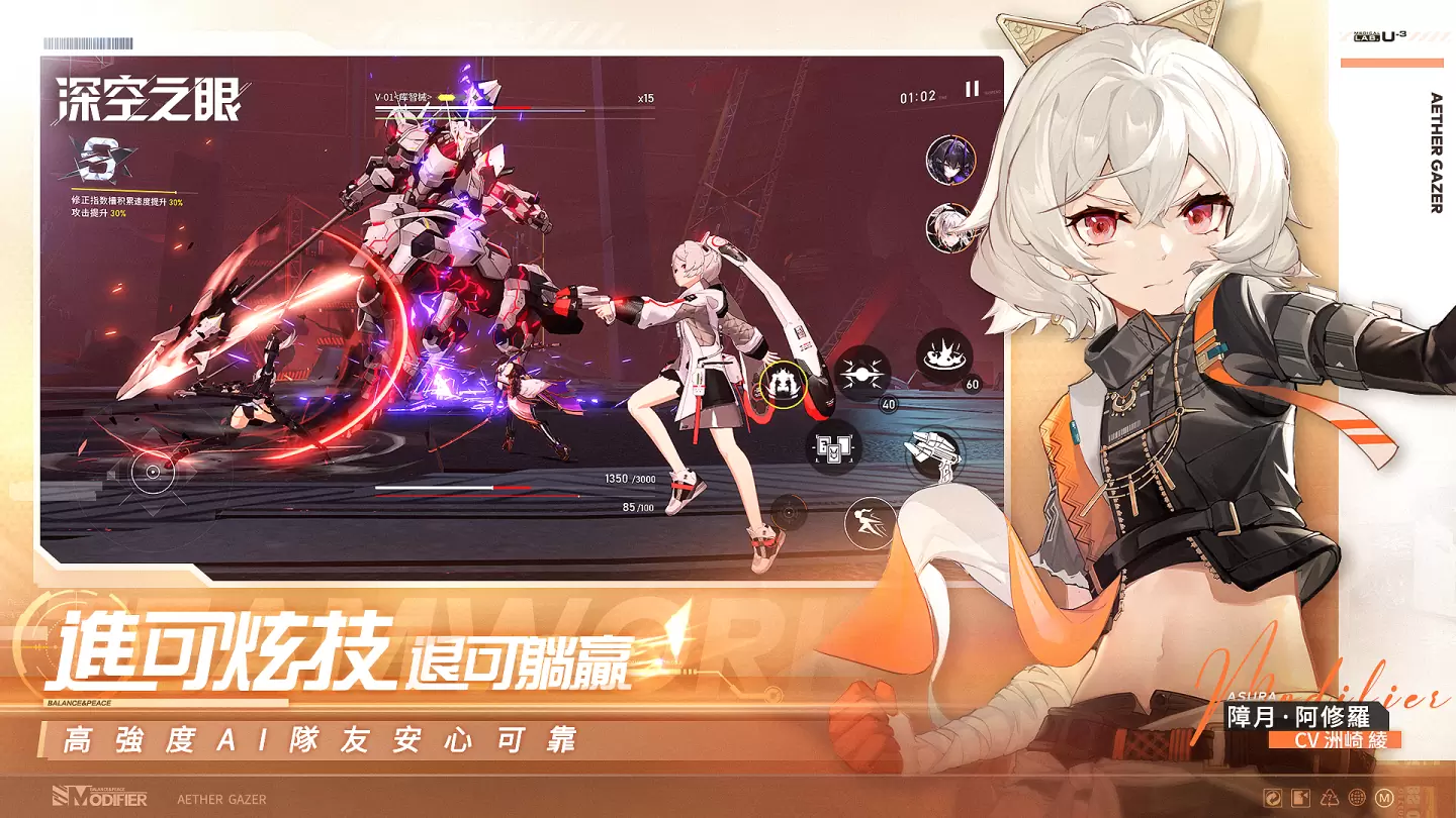 作为一款超神 AI 协战 3D 动作手游,《深空之眼》採用了三名修正者共同出战的模式,AI 队友不仅可以满足治疗、强化、控制等辅助需求,更能发挥超强连招打出巨量伤害,帮助玩家轻鬆闯关!更有高燃连携奥义机制点燃战场,锁定胜局!