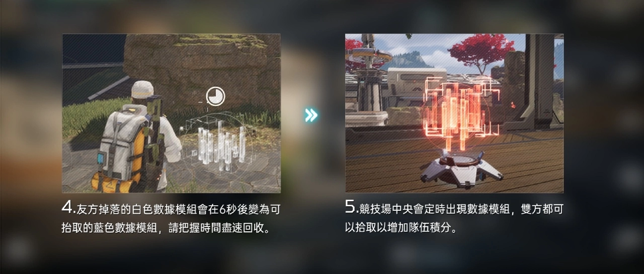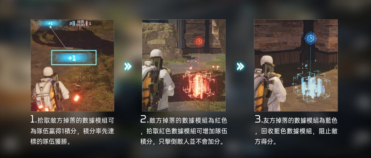 让 PVP 作战更为紧凑激烈,此玩法作战範围更小,也更加考验玩家的战术运用。具体规则为玩家被击倒后掉落数据模组,收割敌方玩家的数据模组以达成胜利。