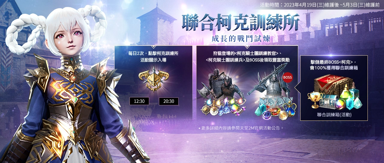 【联合柯克训练所】:4/19 维护后~5/3 维护前,活动期间内每日 2 次,点击柯克训练所活动图示入场,狩猎登场的「柯克骑士团训练教官」、「柯克骑士团训练兵」及 BOSS 后领取丰富奖励;击倒最终 BOSS「柯克」会 100% 获得「联合训练箱(活动)」。