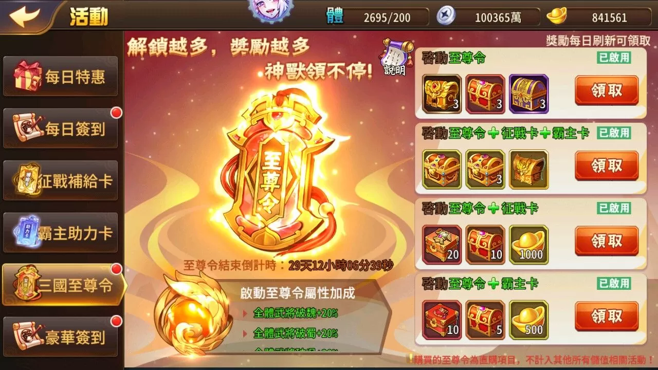 三国至尊令将在本次改版后登场,玩家可在指定时间内启动三国至尊令,获得攻击、防御与血量加成外,还将提升全体抗破属性!此外,至尊令启动期间每日皆能领取至尊礼包,若同时启动征战补给卡、霸主助力卡,还能同时领取更高阶的至尊礼包,每日最多可领取四种,为主公的百万雄兵增粮添饷!