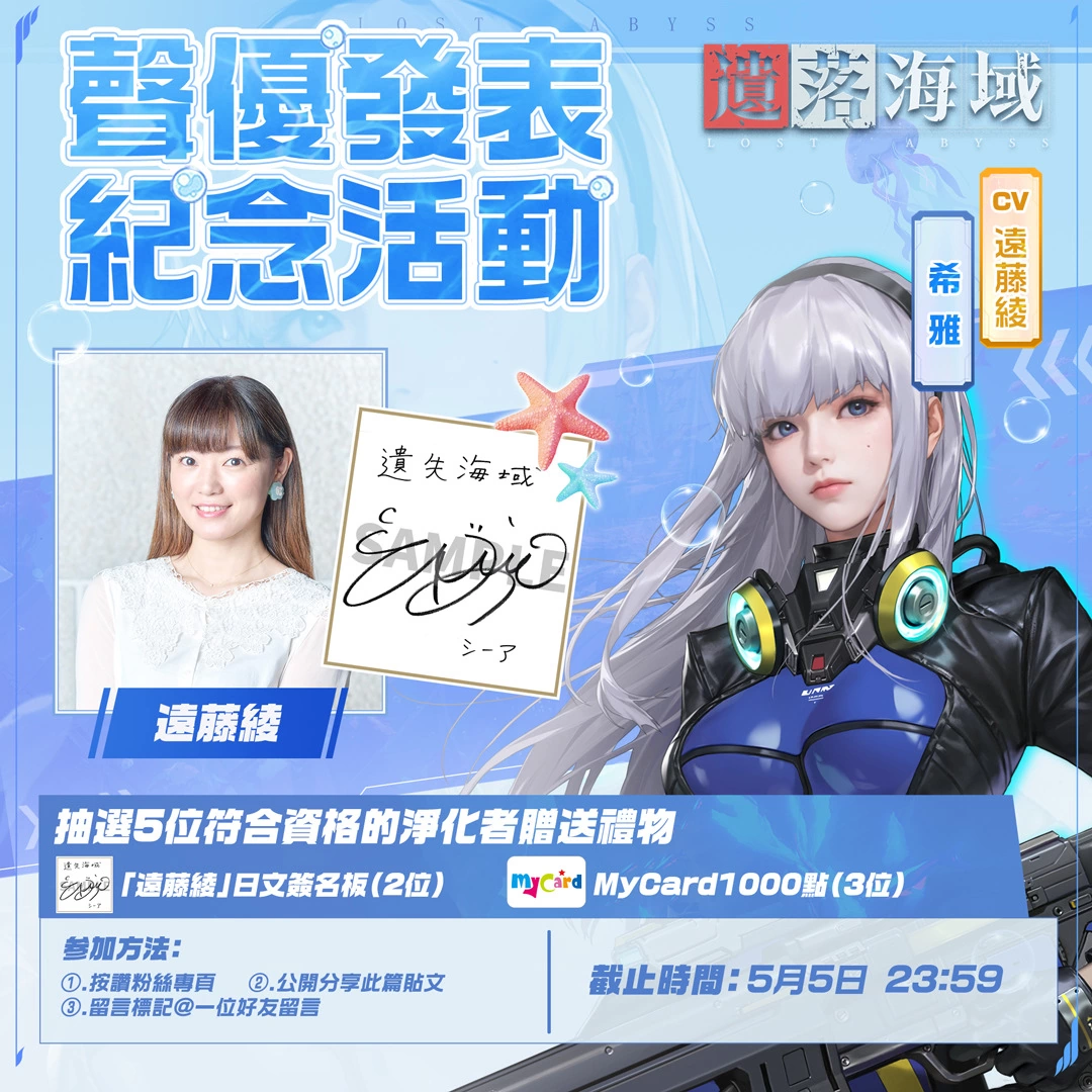 《遗落海域》为纪念发布声优演出阵容,特别于官方Facebook粉丝团举办留言分享活动,凡于粉丝团活动贴文底下留言标记好友、公开分享活动贴文的净化者,皆可参与活动。将有机会获得游戏主演声优远藤绫、井上和彦老师的亲笔签名板,千万别错过这个机会!