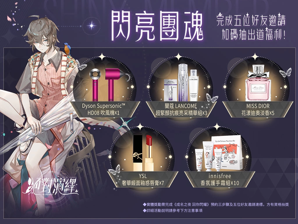 完成事前预约任务,邀请好友一起进入演艺圈往成名之路迈进,邀请好友数量越多,可以获得更多虚宝奖励之外,同时加码抽出闪亮出道五大好礼,等你抱回家!后续将会公开更多相关资讯,敬请密切注意《绝对演绎》粉丝专页!