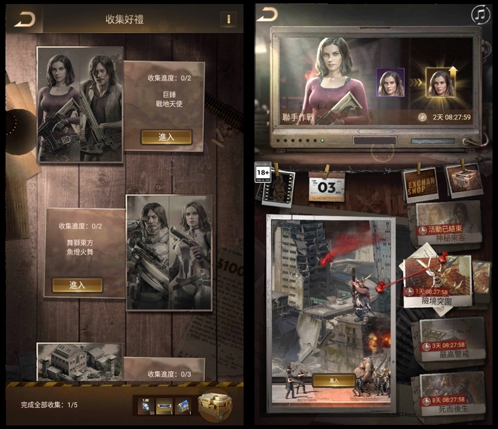 寻找「蛛丝马迹」,展开「线索追蹤」。玩家需要完成特定任务获得「贴纸」,透过不断收集贴纸,寻找达里尔和玛姬失蹤的线索,并可兑换优渥奖励!同时,听说在废土世界遍布的「倖存者营地」,有耳目灵通者或许知道些什幺,派遣队伍营救他们吧!