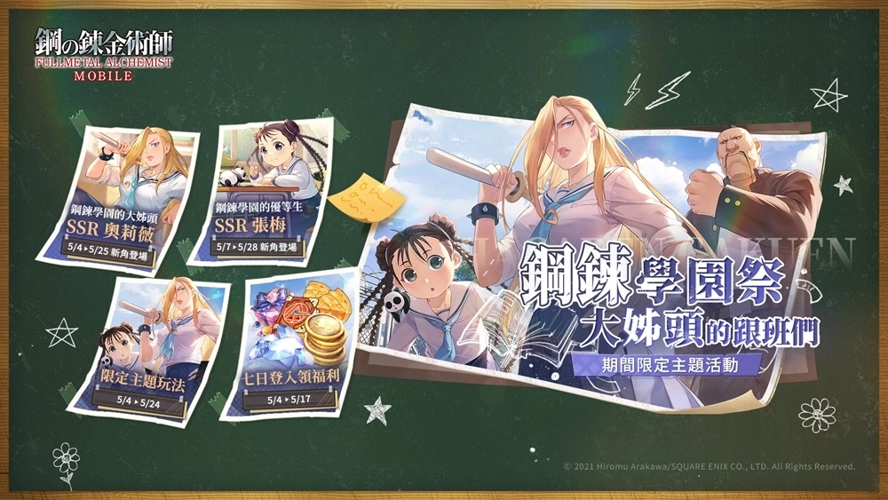 钢鍊学园祭热闹开启!即日起参与《钢之鍊金术师M》全新系列主题活动「钢鍊学园祭」即可兑换限定头像框、限定 SSR 记忆武装等丰富道具奖励,还有全新制服外观的「SSR 奥莉薇 钢鍊学园的大姊头」与「SSR 张梅 钢鍊学园的优等生」霸气亮相,与你一起守护钢鍊学园的荣耀。