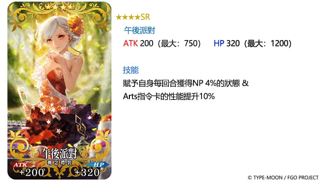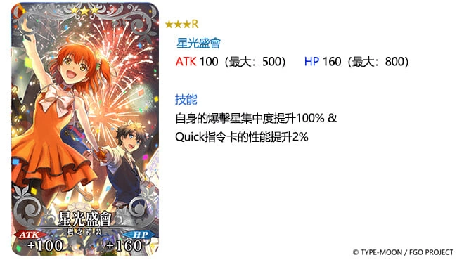 同期间登场的,还有曾于「FGO 2019 ~2nd Anniversary~特异点PICK UP召唤(每日变更)」中,实装的「★5(SSR)迦勒底週年纪念」、「★5(SSR)午后派对」及「★5(SSR)星光盛会」等3种限时概念礼装。