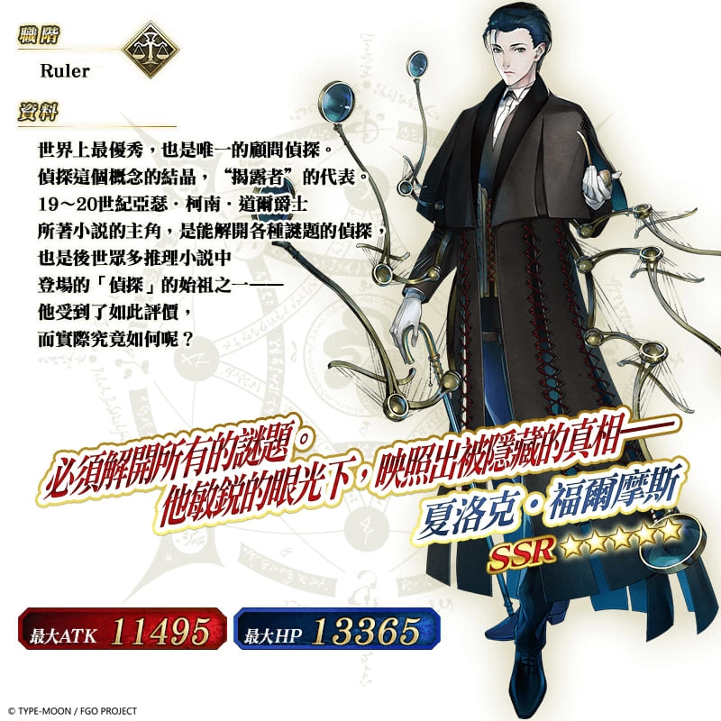 自 5 月 9 日(二)维护后开启的「Fate/Grand Order Fes. 2023 ~6th Anniversary~」举办纪念 PICK UP 召唤,世界上最优秀、也是唯一的顾问侦探「★5(SSR)夏洛克・福尔摩斯」,透过宝具「这是基础,我亲爱的朋友啊」施展,将赋予我方全体无敌贯通状态、无视防御状态及提升爆击威力,并使敌方全体防御力下降。