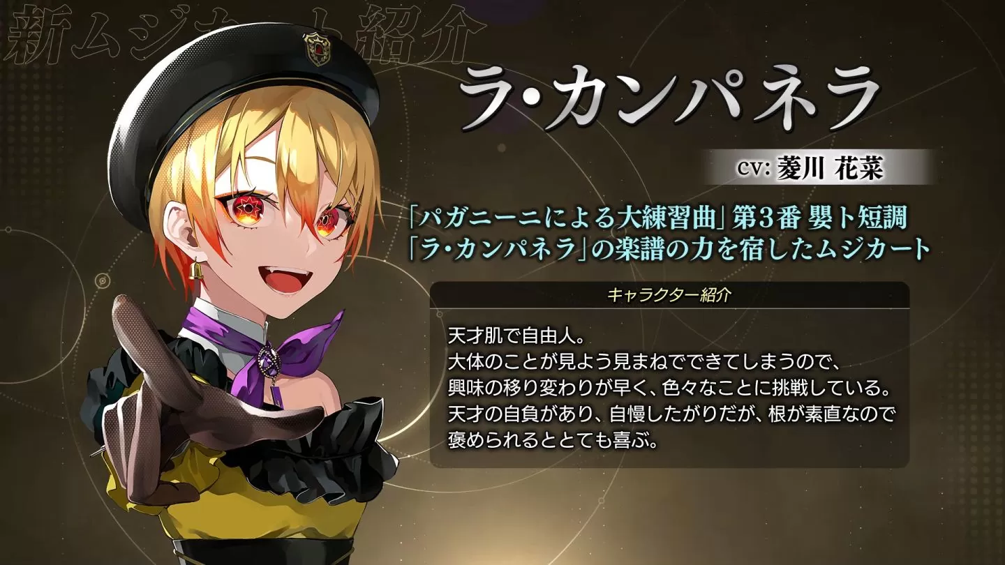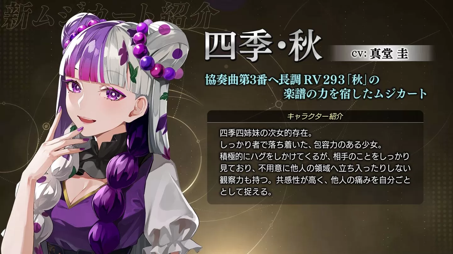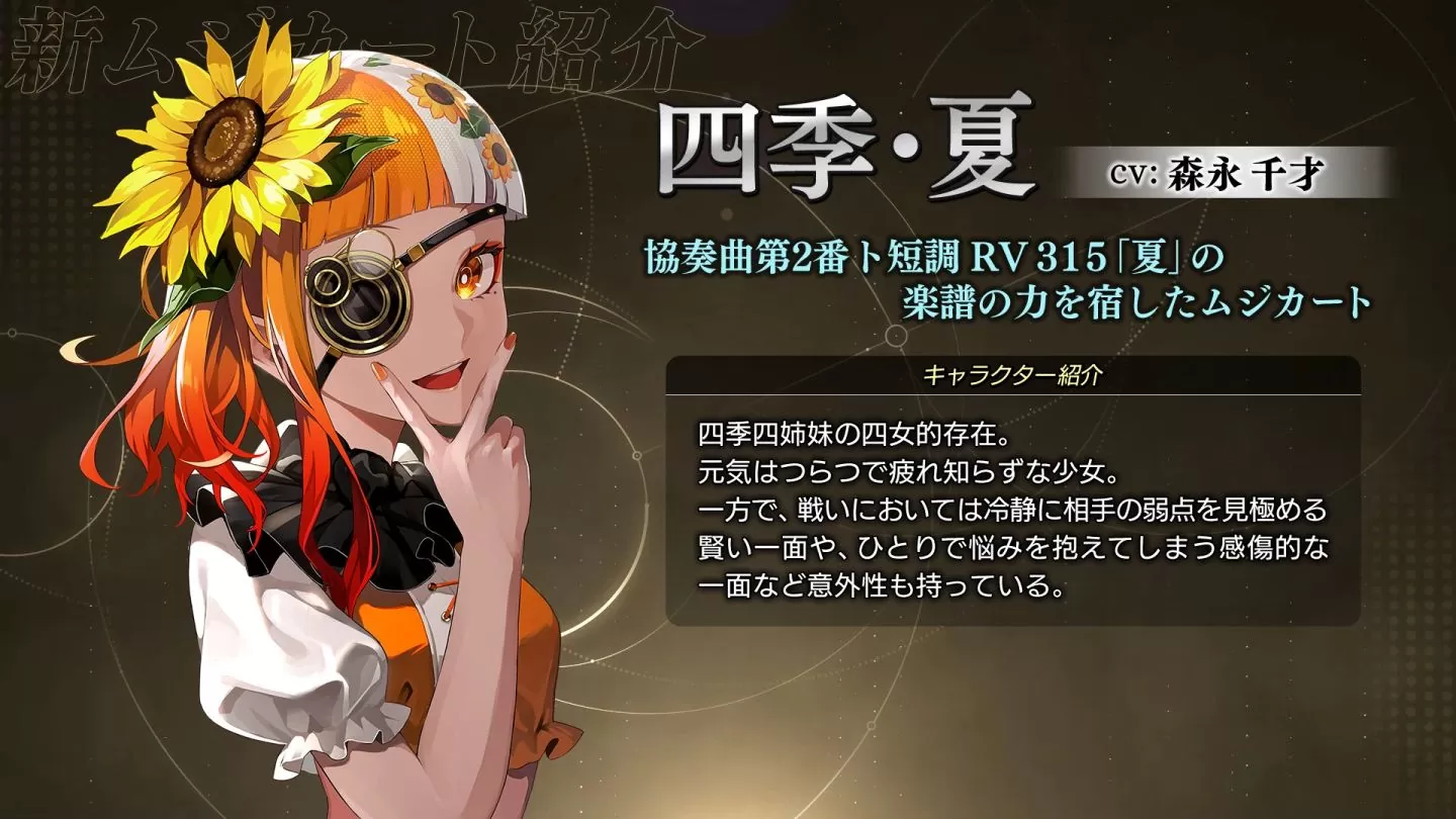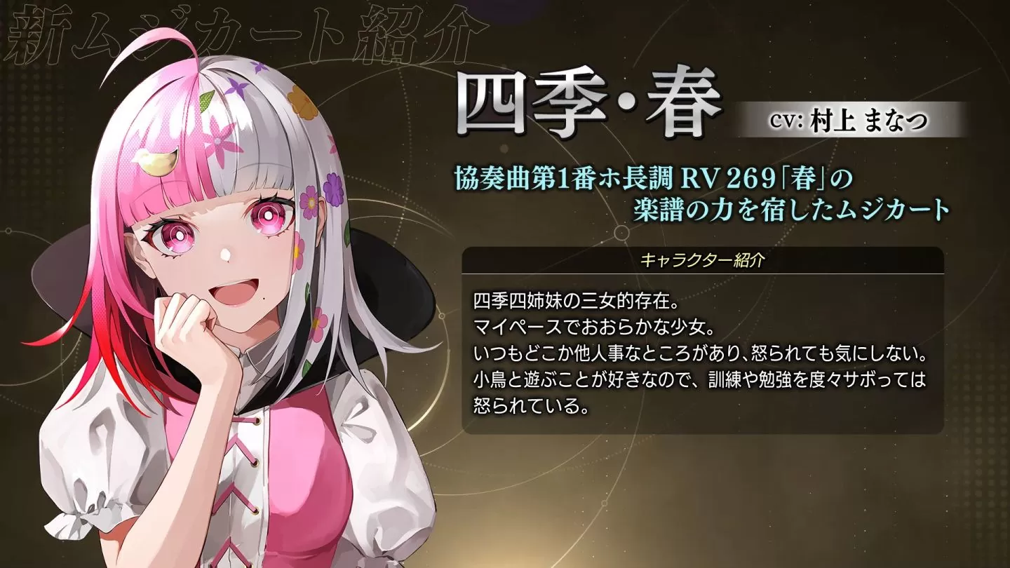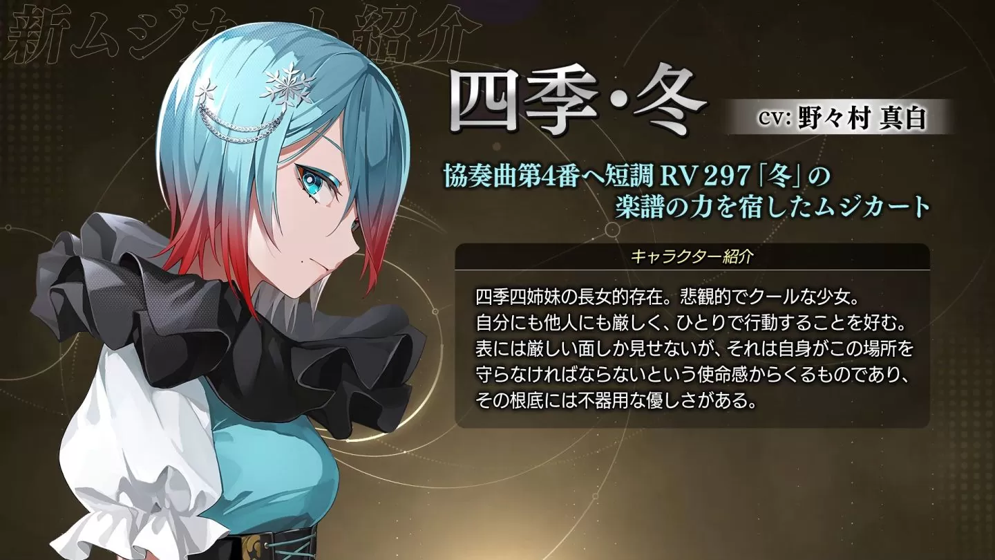 由韦瓦第第创作的小提琴协奏曲《和声与创意的实验》中的E大调第一协奏曲 RV 269「春」、G小调第二协奏曲 RV 315「夏」、F大调第三协奏曲 RV 293「秋」、F小第三协奏曲 RV 297「冬」创作的全新角色及乐装公开,将会在公测的游戏内容中与指挥者们见面。