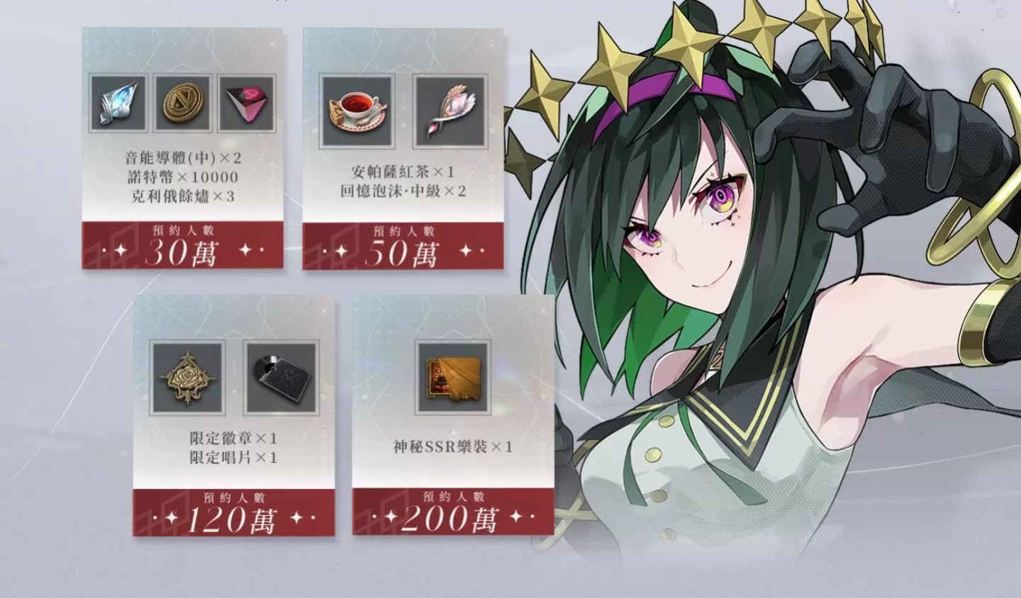 -预约达标30万:『音能导体(中)x2』、『诺特币x10000』、『克利俄余烬x3』