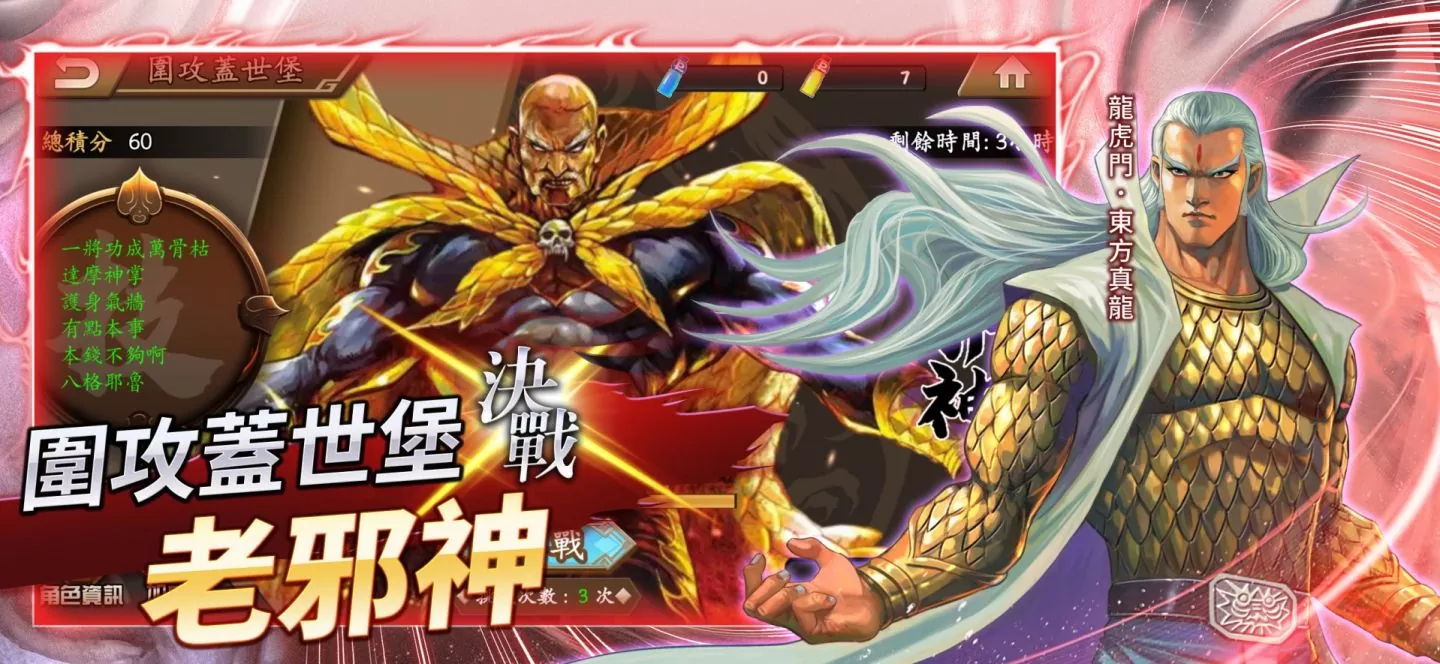 再现原作珍宝阁、藏珍库、星云塔!组成你的最佳队伍勇闯盖世堡,敌我能力加成任你选择,以你最擅长的方式击倒强敌成为「最佳玩家」。此外,隐藏老大「老邪神」更会随时出现,只要以限定次数打败强敌,即可获得奖励分数取得至高成就。