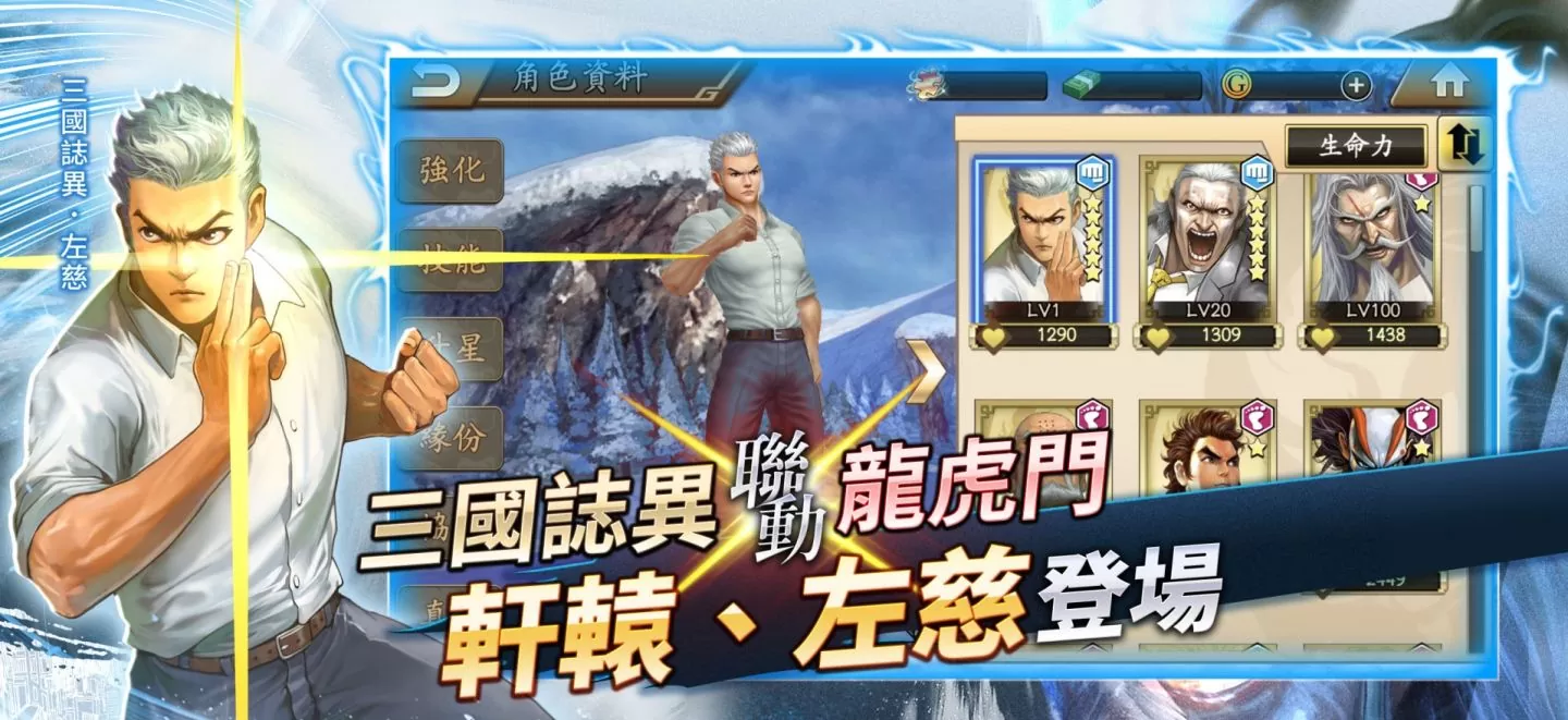 《三国誌异》是知名漫画家「郑健和」老师,主编的三国时代港漫作品。故事人气角色,轩辕黄帝、神人左慈,以全新形象现身《龙虎门M》,让玩家们能够在游戏中目睹经典角色的风采以及实战中的亮眼表现!