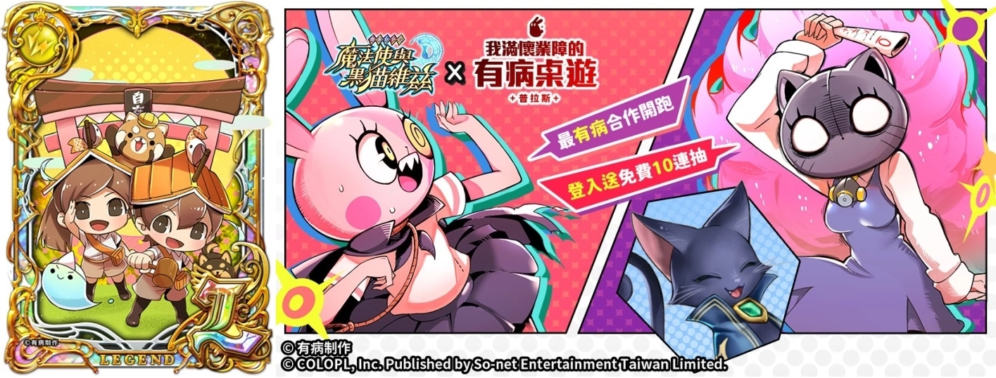 So-net 今(18)日公布《问答RPG魔法使与黑猫维兹》与台湾独立游戏团队「有病制作」开发的《有病》系列第三部作品《我满怀业障的有病桌游普拉斯》展开合作!活动期间推出限定合作关卡等玩家体验,另外还有限定转蛋、精灵等大家收藏。