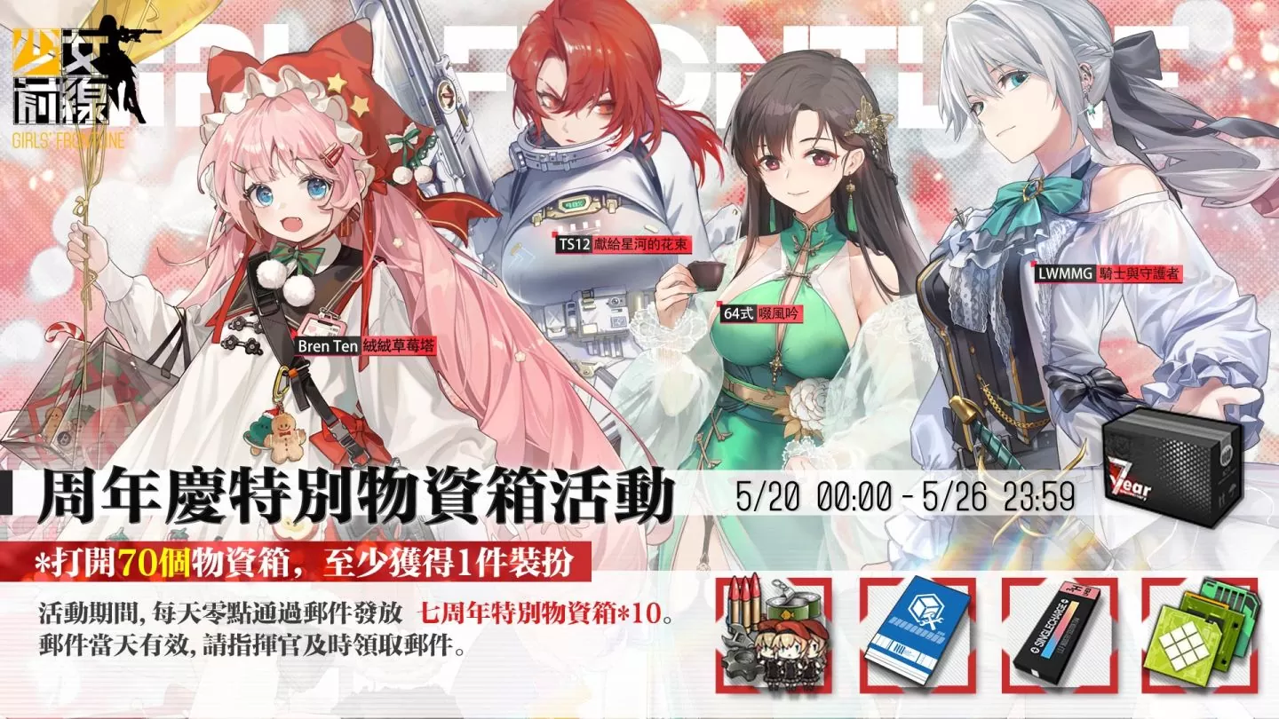 每日登入游戏透过邮箱可获取 10 个 7 周年特别物资箱,打开「7 周年特别物资箱」将有机率获取包含「Bren Ten-绒绒草莓塔」、「TS12-献给星河的花束」、「64 式-啜风吟」、「LWMMG-骑士与守护者」以上装扮在内的丰厚物资补给奖励!