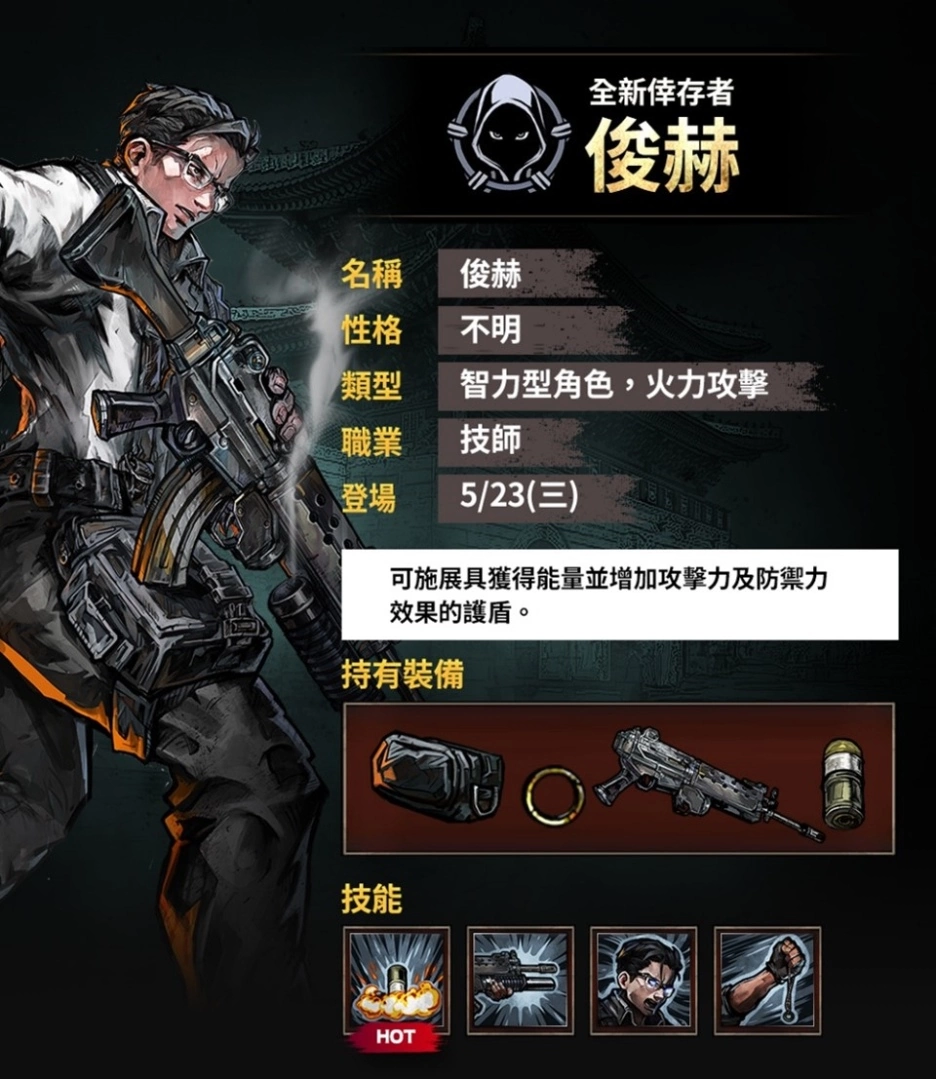 外传《首尔》中还推出了一位全新的韩国倖存者角色,名为「俊赫」。俊赫曾是一名初中教师,现在领导着居住在地铁站的倖存者团体。与《阴尸路:全员出击》中的现有倖存者不同,俊赫的属性是「不明」。不明倖存者需要与其他现有倖存者配对才能展示出真正价值,且他们无法独立行动。