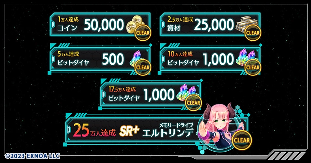 为庆祝游戏上线日公开,官方推特预定举办跟随转推活动,只要转发指定推文官方就会抽出共 303 位幸运儿赠送价值 1 万元的 Amazon 礼物卷,而目前仍在进行中的事前登录活动已突破 25 万人,将在上线时赠送游戏内货币、转蛋用钻石、材料与 SR+Memory Drive「エルトリンデ」给所有玩家。